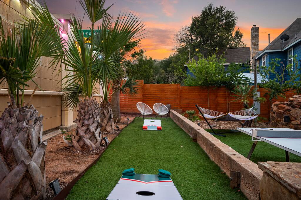 Game-friendly backyard: ping pong, cornhole, outdoor TV & sound system